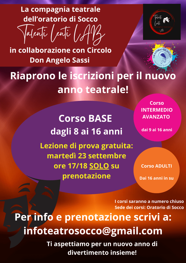 Il più vicino nel tempo: 23 settembre ore 17 – prova gratuita per il corso base dei ragazzi dagli 8 ai 15/16 anni presso l’oratorio di Socco.
